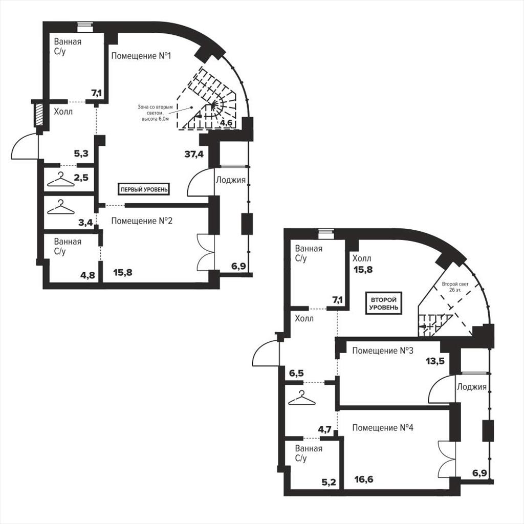 Жилая площадь 107.54 м2, кухня 38.1 м2, квартира без отделки.