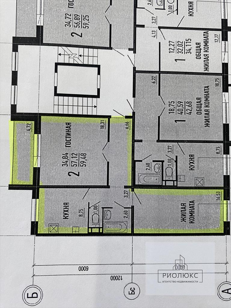 общая 57,2 м2, жилая 35 м2, кухни 9 м2 |
