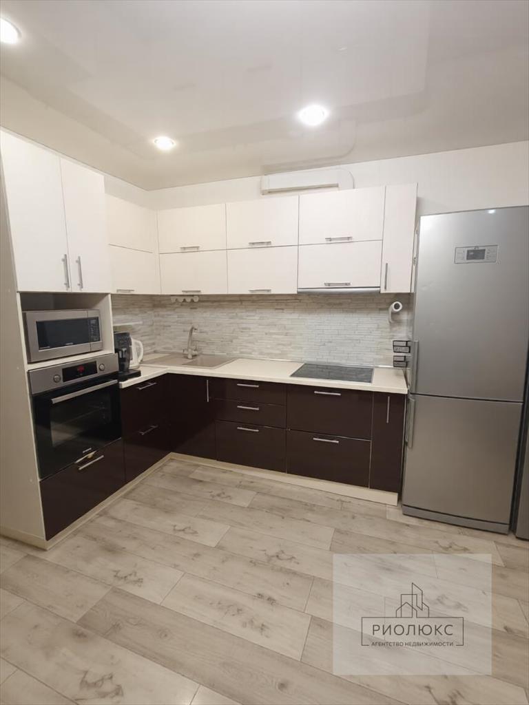 <li>Остается современный кухонный гарнитур и техника (духовой шкаф, варочная панель, вытяжка), большой диван в кухне-гостиной</li>