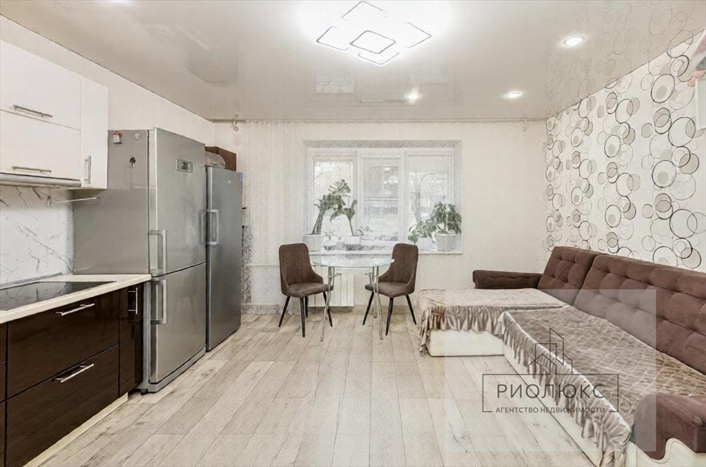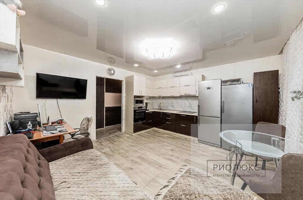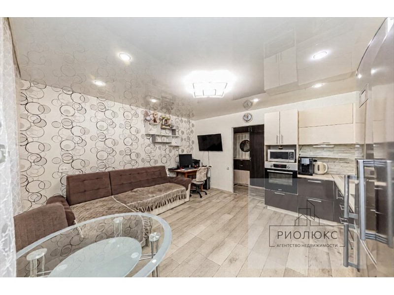 <li>Остается современный кухонный гарнитур и техника (духовой шкаф, варочная панель, вытяжка), большой диван в кухне-гостиной</li>