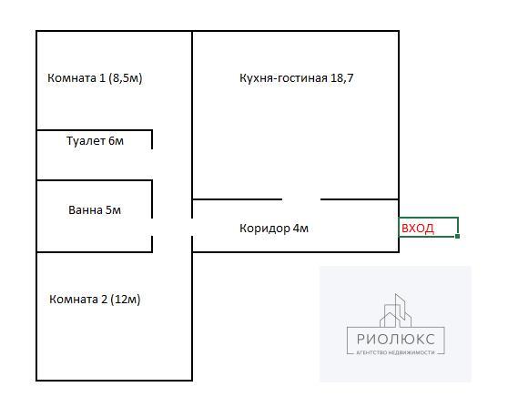 Площадь квартиры 52,4 кв.м: кухня-гостиная – 18,7 кв.м, две раздельные комнаты – 8,5 кв.м и 12 кв.м, ванна 5 кв.м, туалет 6 кв.м<br />