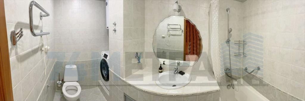 • Просторная ванная комната: облицована светлым кафелем, имеет нишу под стиральную машину и вместительный накопитель для хозяйственных вещей. Все продумано до мелочей!