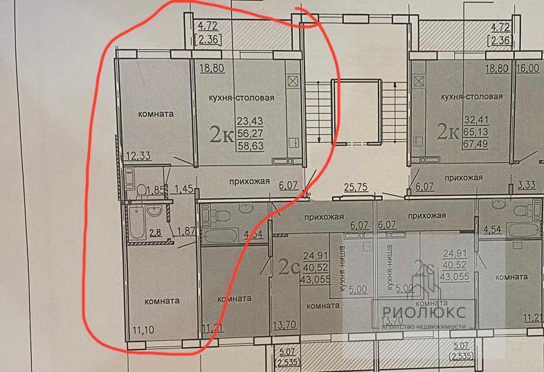 общая 56,3 м2, жилая 42,23 м2, кухни 10 м2 |